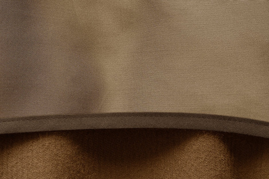 The jacket is lined halfway down the back with a smooth and slinky satin, cut as a single panel. It helps with sliding the jacket on and off, being as the outer cloth has the potential for friction. The sleeves, too, are lined with the same cloth.