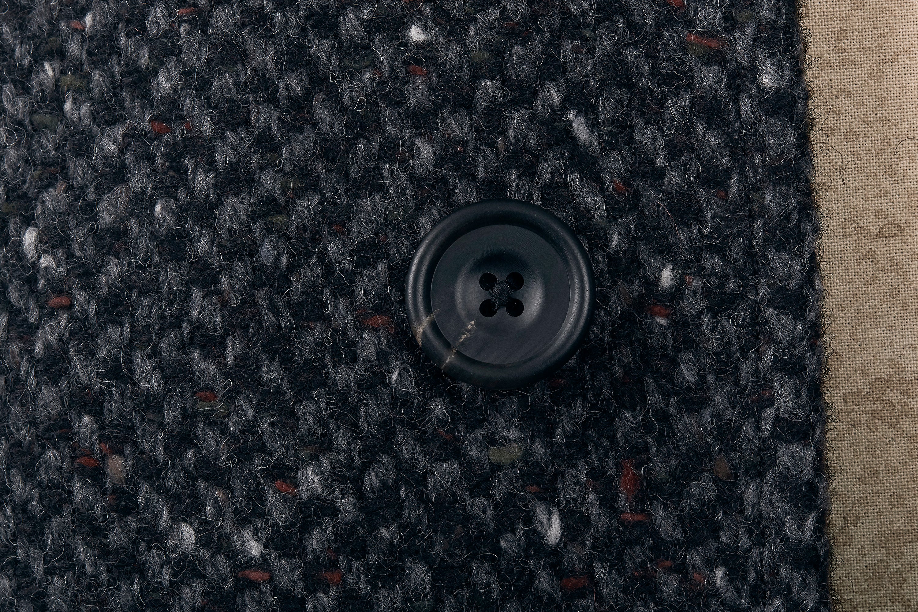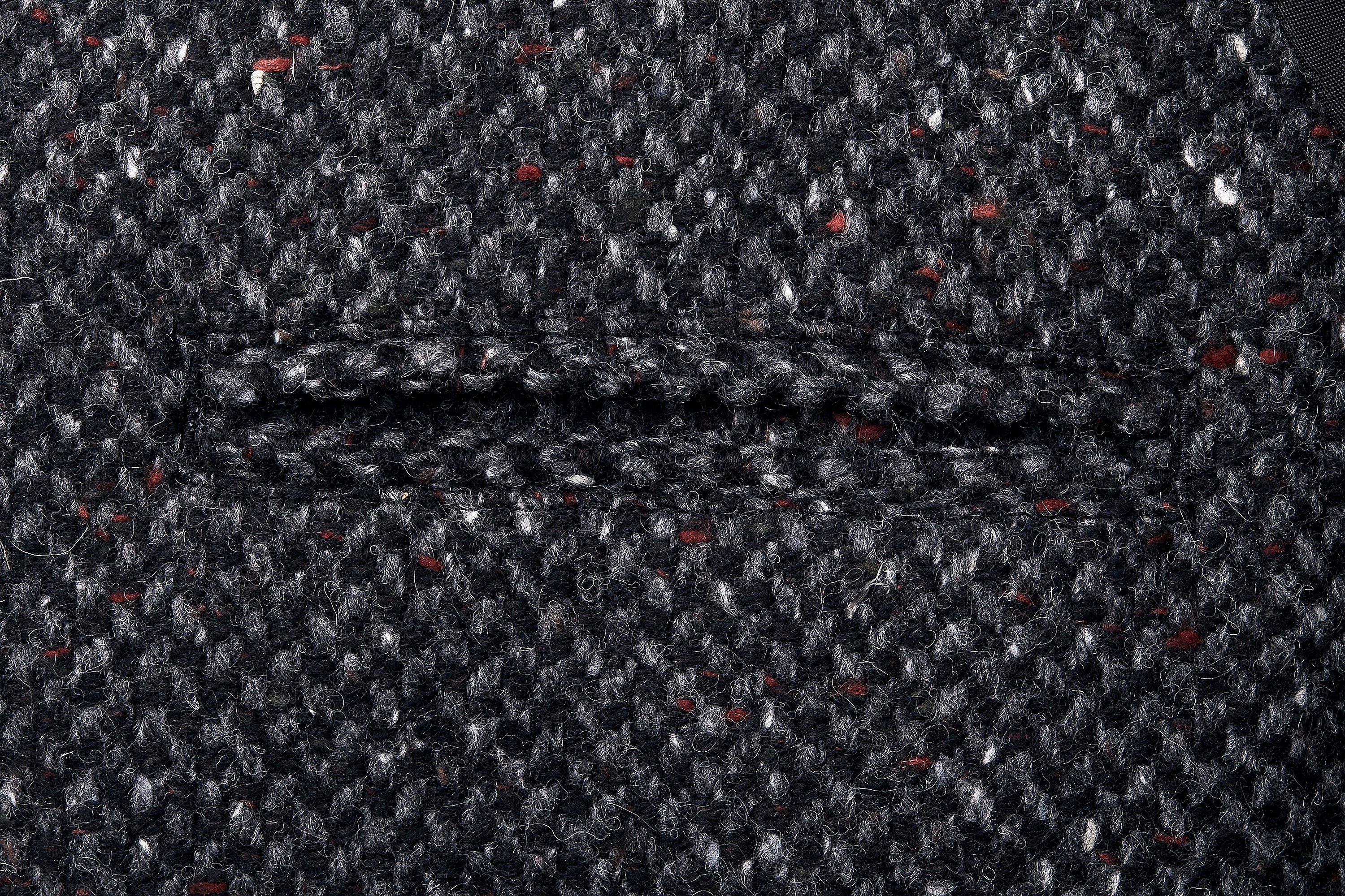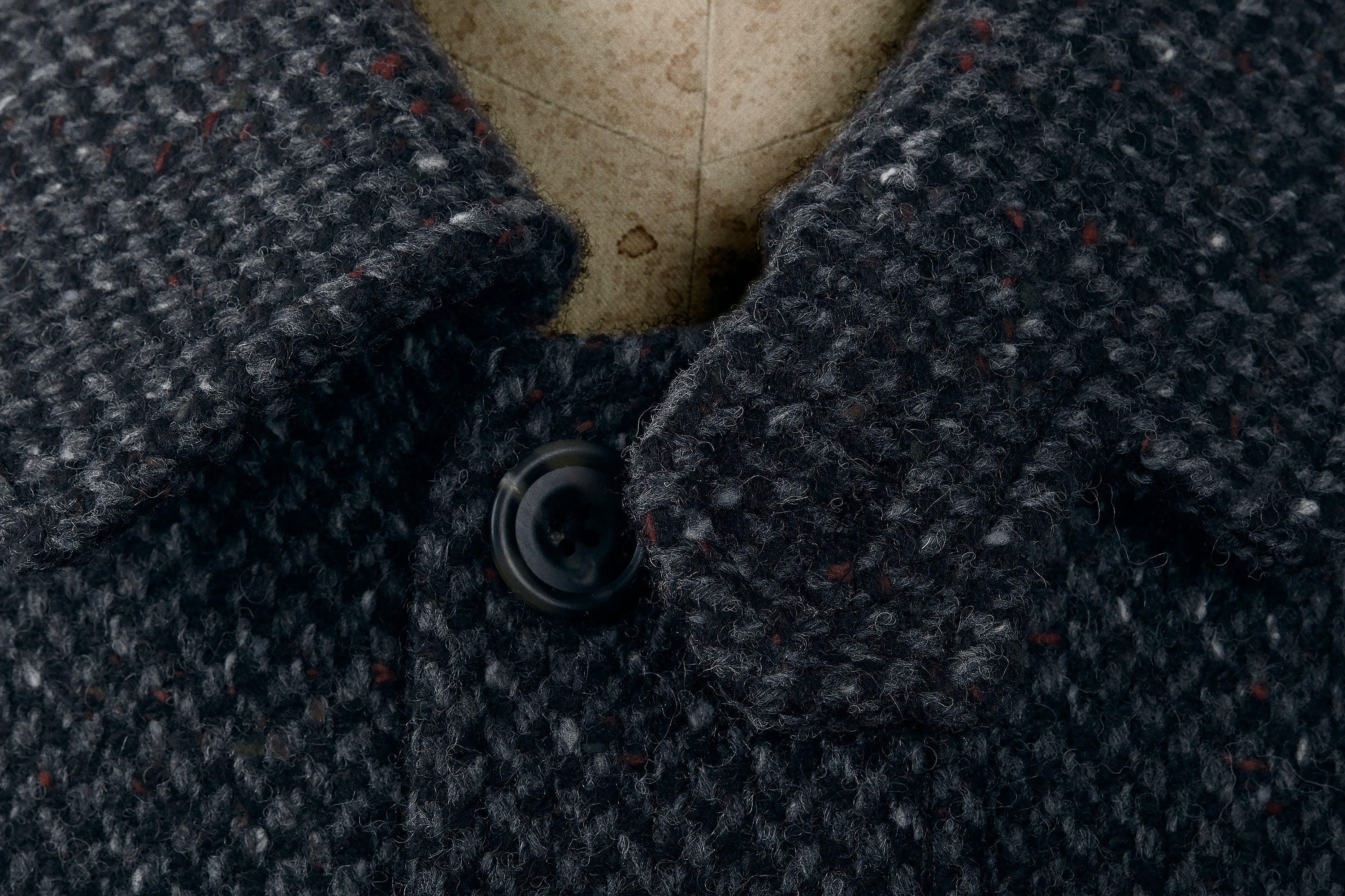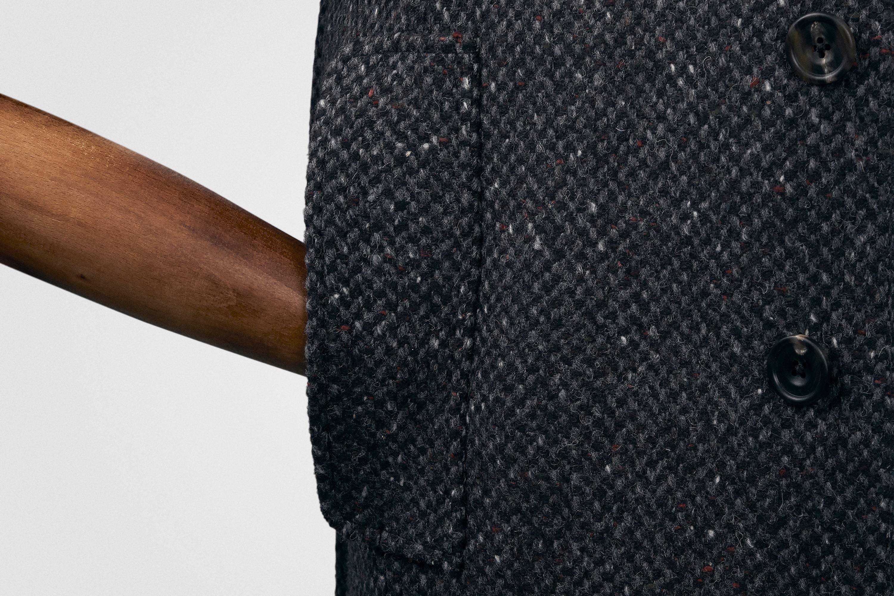 The cloth is thick, heavy barleycorn tweed, Donegal writ through. The yarn — a warp of dark grey and a weft of black — is alive with little flecks of unexpected shades, from amber to magenta. It is merino lambswool, softer than one might assume, and fairs mightily well in the wet and the windy.