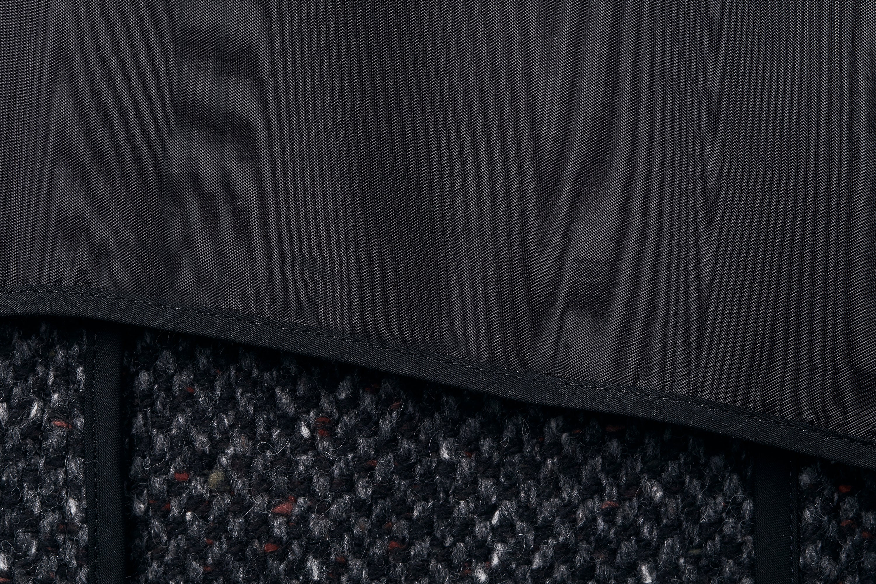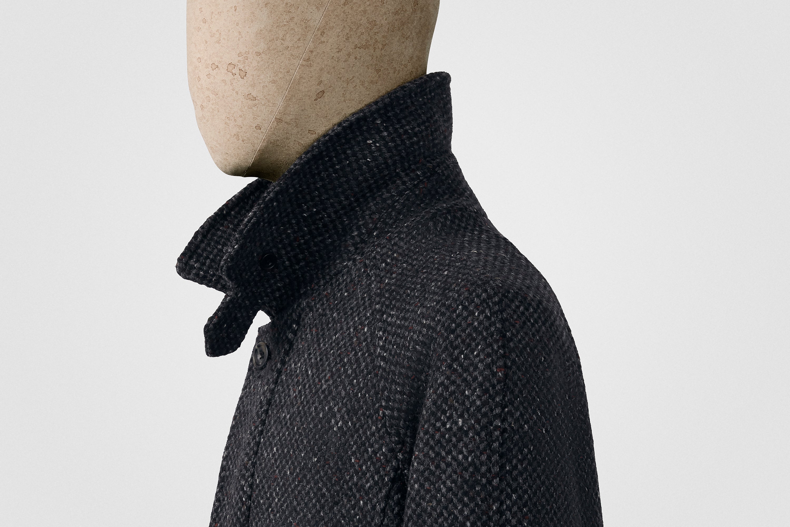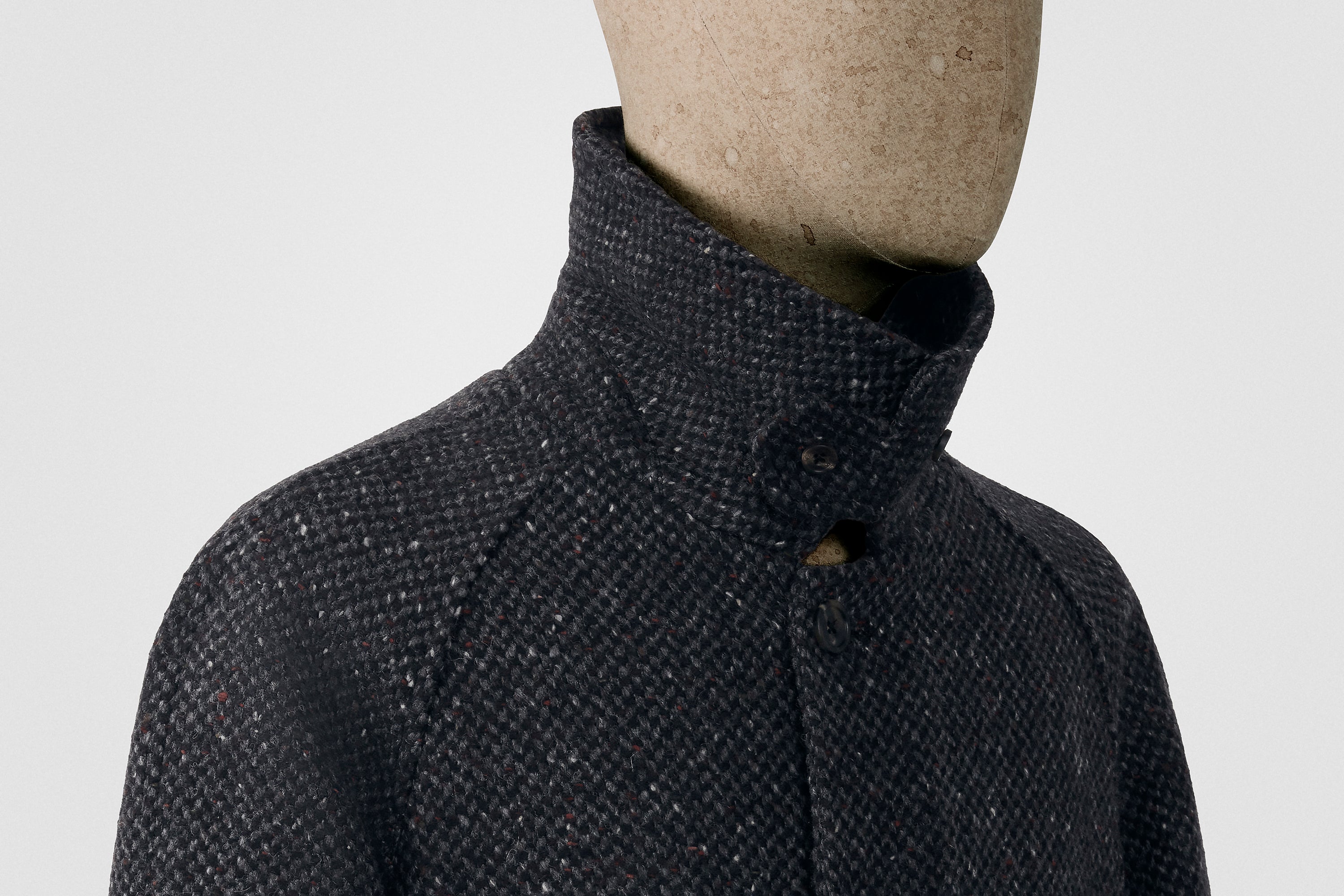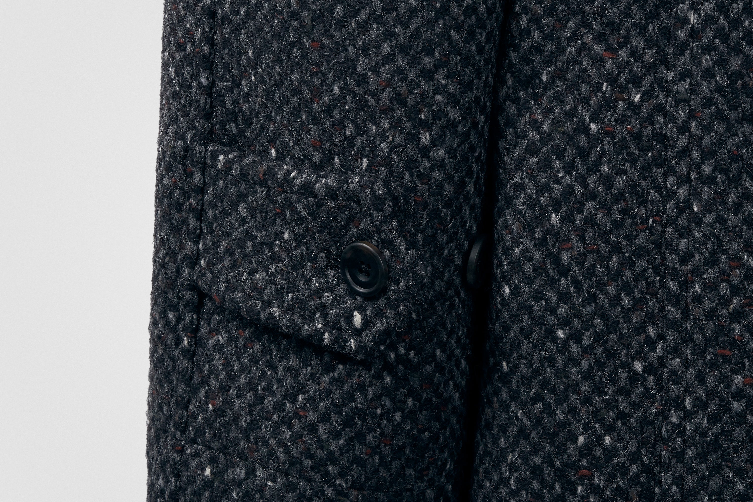 The cloth is thick, heavy barleycorn tweed, Donegal writ through. The yarn — a warp of dark grey and a weft of black — is alive with little flecks of unexpected shades, from amber to magenta. It is merino lambswool, softer than one might assume, and fairs mightily well in the wet and the windy.
