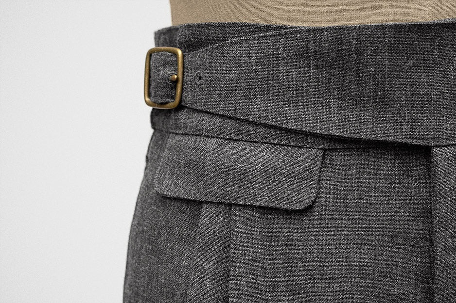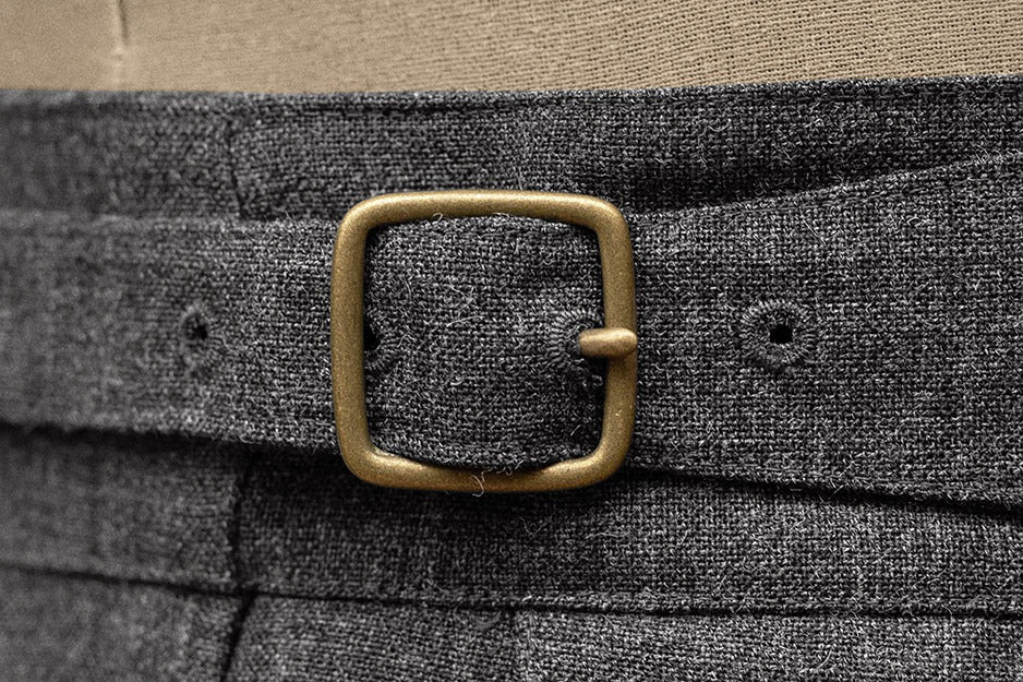 The trousers fasten with a buckle at the side. How this works is, the waistband keeps going, past the fly, and meets a buckle attached to a tab on the right side as worn. Works like a belt, gives a clean look at the front, and means the wearer can adjust the size should they shrink or grow over the passage of time.