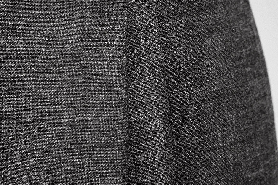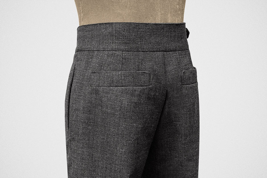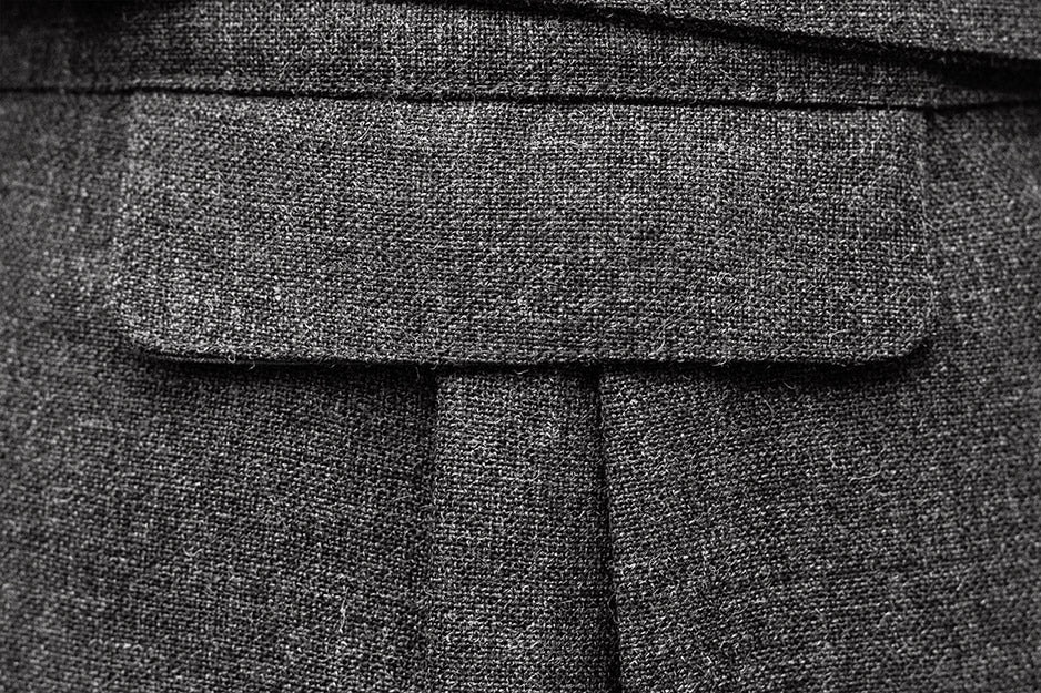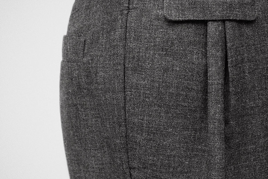 The front of the trousers has two pleats on each side. They are stitched down by a length of two inches from the base of the waistband, and then, with horizontal bar-tacks as punctuation, fan out, providing the front of the trousers with shape, comfort, and ample room for pocket-rummaging.