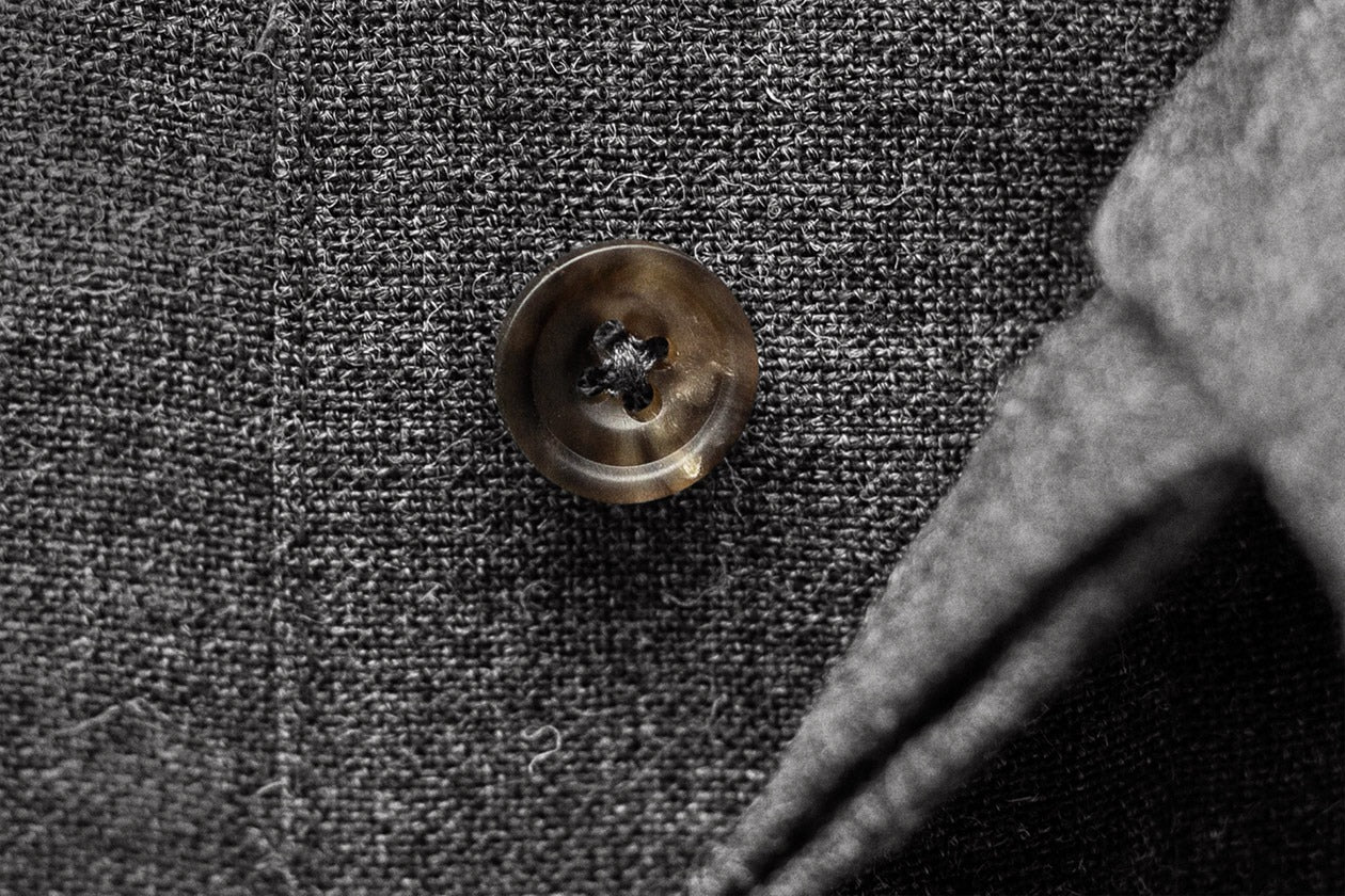 The horn buttons are cut, shaped, and polished by the last horn button-makers in Britain. Relocated from the Midlands to the Cotswolds, they continue a tradition going back to the 18th century."It is no easy task,"claimed William Hutton in 1780,"to enumerate the infinite diversity of buttons made in Birmingham."