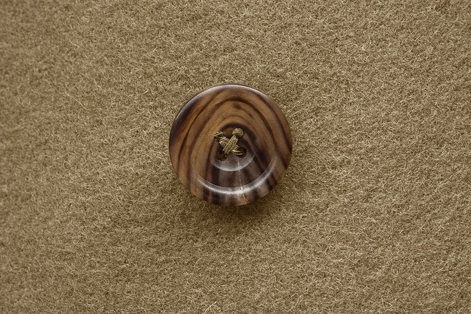 The horn buttons are cut, shaped, and polished by the last horn button-makers in Britain. Relocated from the Midlands to the Cotswolds, they continue a tradition going back to the 18th century."It is no easy task,"claimed William Hutton in 1780,"to enumerate the infinite diversity of buttons made in Birmingham."