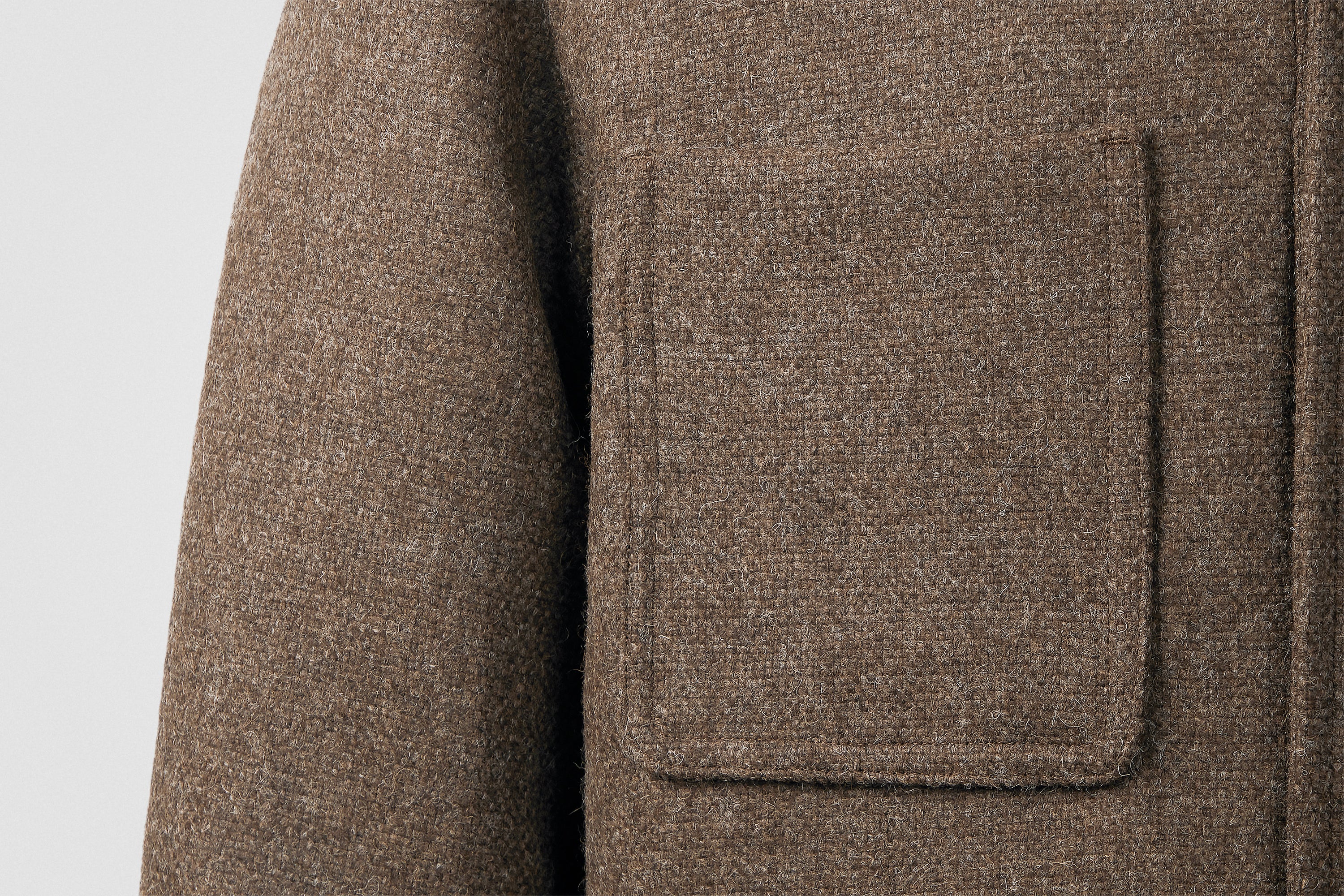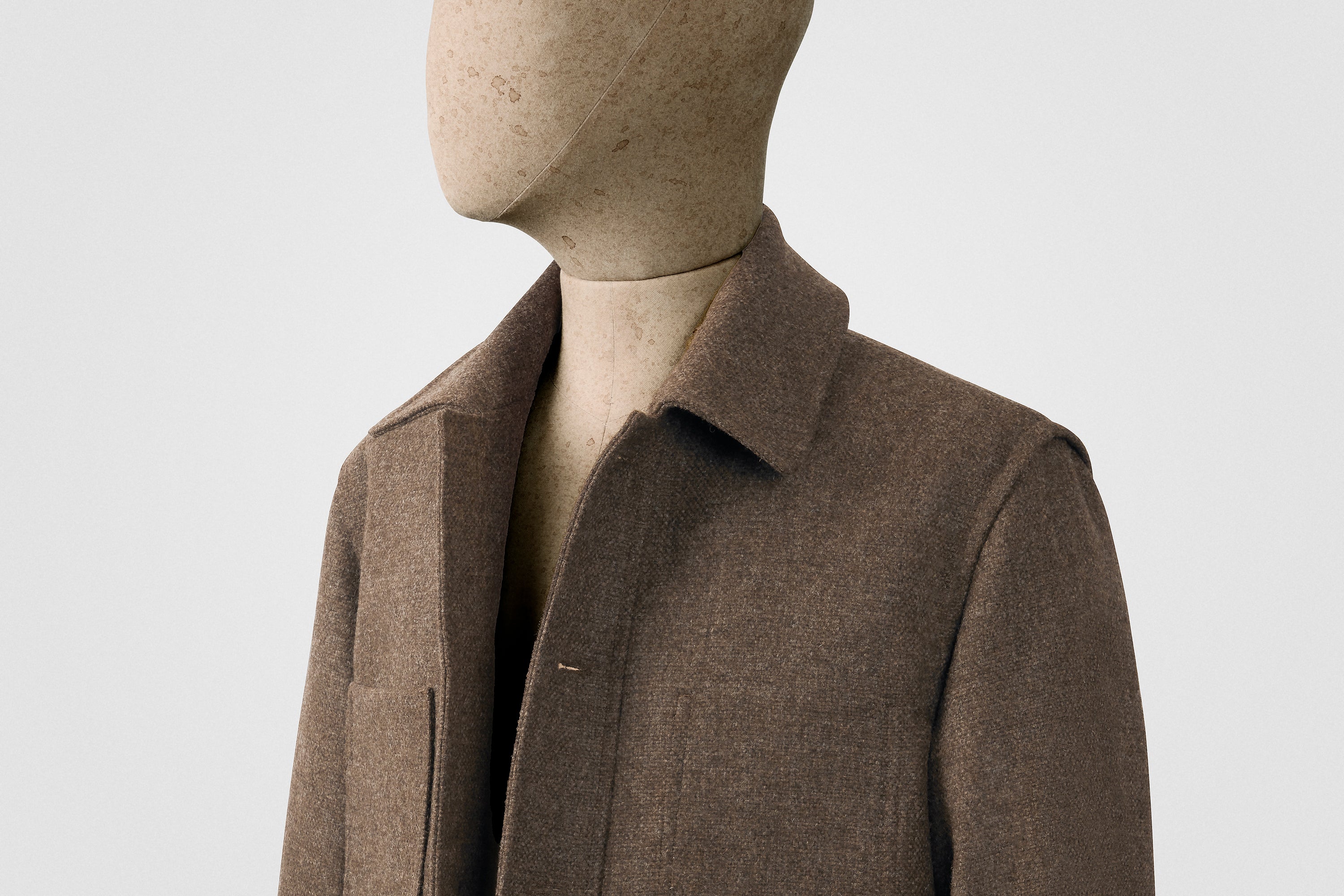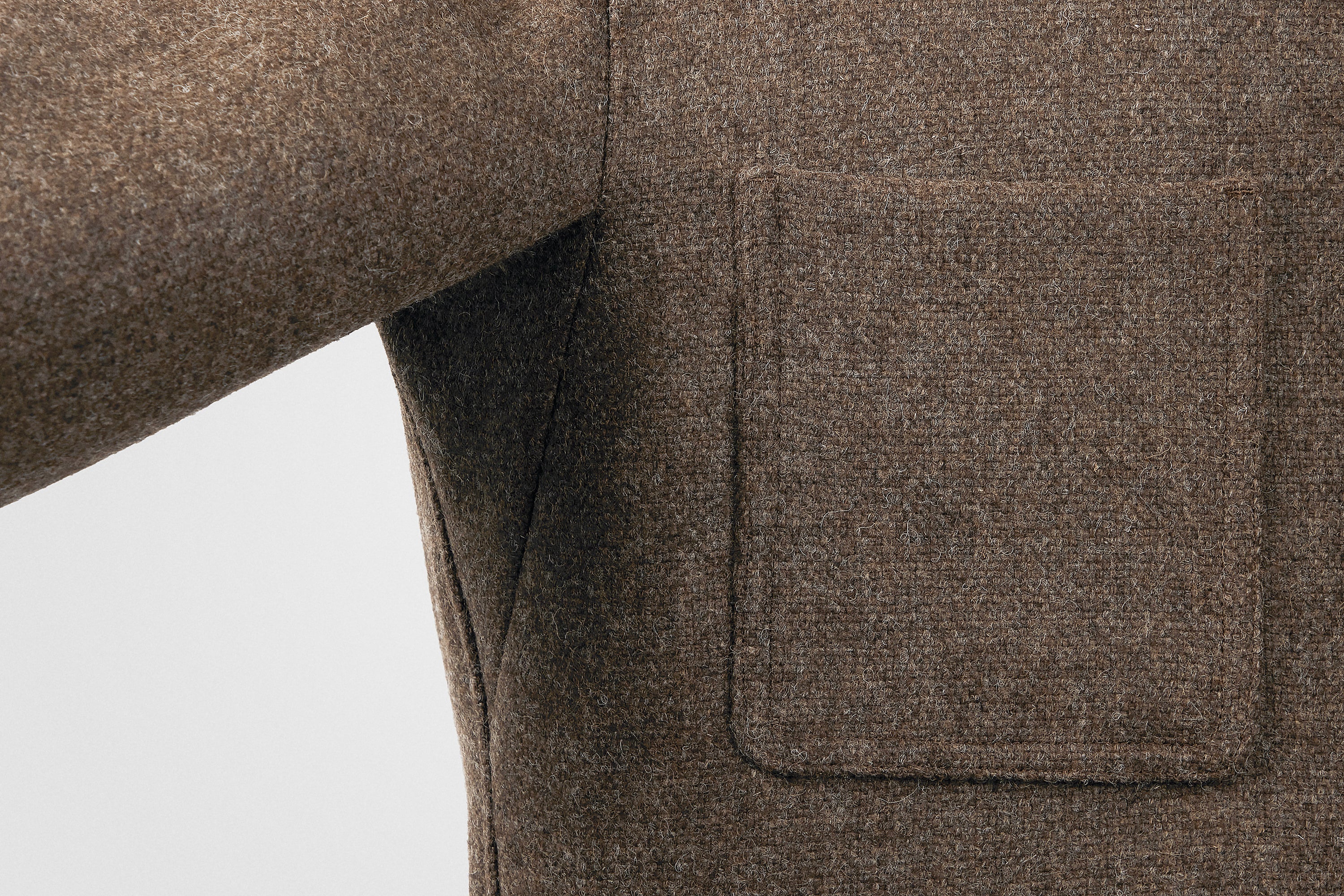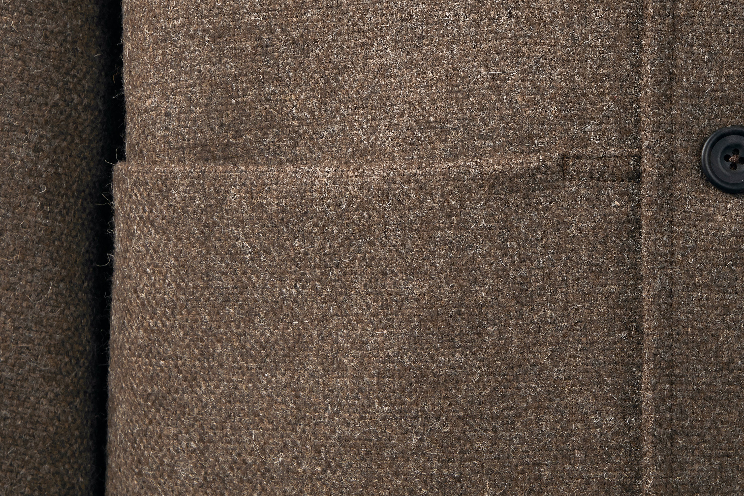 Veste de travail en hopsack de laine, fabriquée à Londres, avec un tweed des Hébrides de poids moyen (17 oz) à deux moutons - et avec des boutons en corne des Cotswolds.